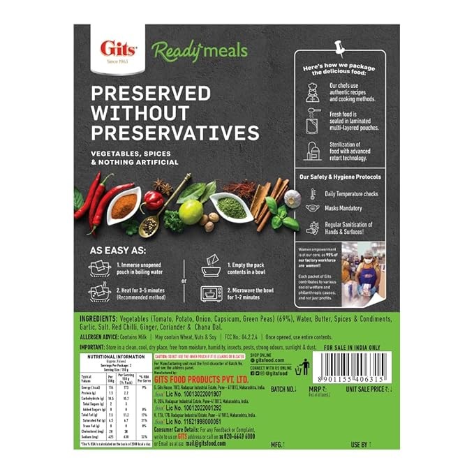 | Manufacturer | Gits, Gits Food Product Pvt. Ltd. Gits House, 18/3, Hadapsar Industrial Estate, Pune-411013. |