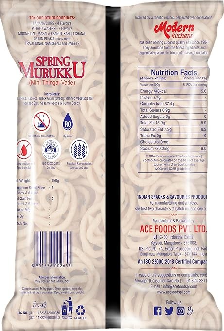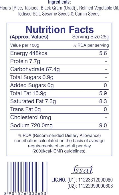 | Ingredients | Flours ( Rice , Tapioca , Black Gram (Urad), Refined Vegetable Oil , Iodized Salt , Sesame Seeds & Cumin Seeds. |