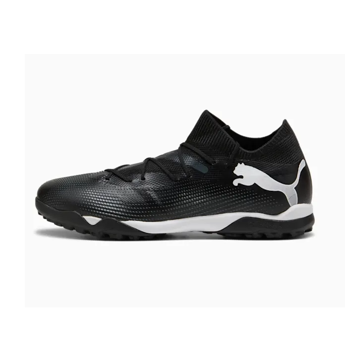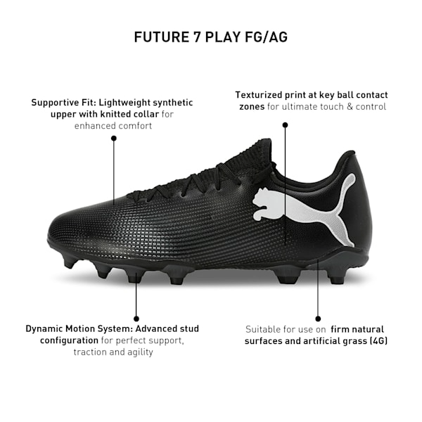 Step into the future of football with PUMA's Men's FUTURE 7 PLAY Turf Ground Football Shoes. These football boots combine lightweight materials with advanced technology to rule the pitch.Key FeaturesLightweight, synthetic upper offers comfort and better touch of the ball. The upper of this shoe is made with at least 30% recycled materials. Texturized print details at key contact zones for enhanced ball grip. Suitable for hard natural surfaces and artificial grass (2G). Low-Profile multi-Studded rubber outsole for traction. More DetailsThese men's turf ground football shoes feature laced closure for a secure fit. Regular to wide fit.