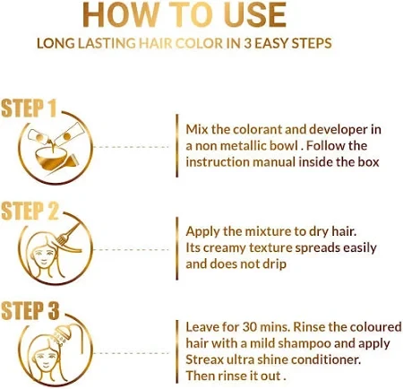 Achieve long-lasting color in just three easy steps: 1. Mix the colorant and developer in a 1:1 ratio using a non-metallic bowl. 2. Apply the mixture to your hair; its smooth gel texture ensures easy, non-drip application. Leave it on for 15 minutes. 3. Rinse your hair with lukewarm water until the water runs clear. For enhanced shine, follow up with a mild shampoo and conditioner.