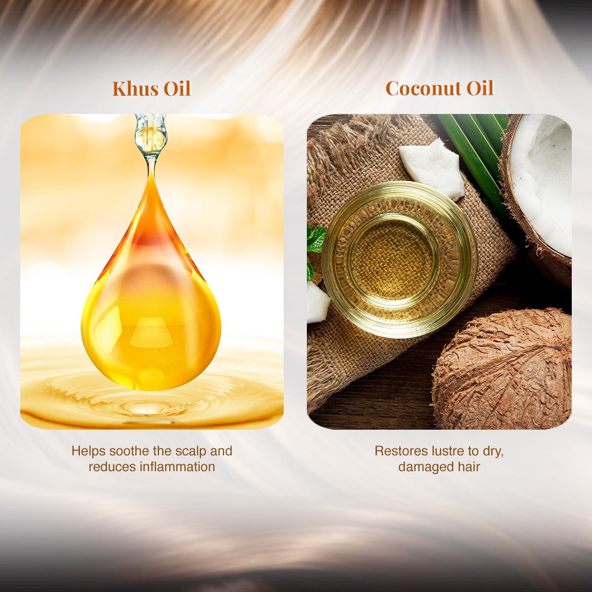 • Khus OilHelps soothe the scalp and reduces inflammationCoconut OilRestores lustre to dry, damaged hair